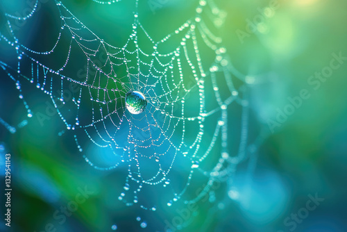 Fototapeta premium A dewy spiderweb glistening in the morning sun, nature's delicate artistry.