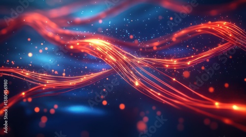 Fototapeta premium A digital abstract design with glowing red and orange connections interwoven across a deep blue background, with sparkling particles that create an energetic, high-tech ambiance