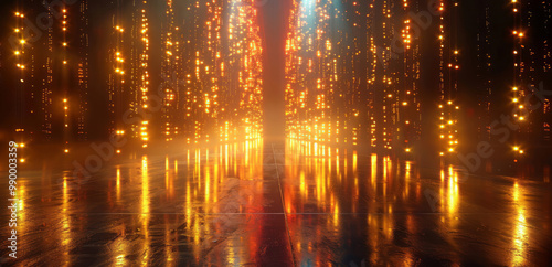 Obraz premium A digital background with gold light and LED lights on an empty stage, creating a futuristic atmosphere for virtual shows.