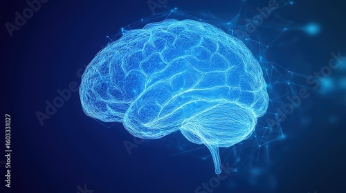 © Naknakhone, Obraz premium A digital blue wireframe representation of a human brain with neural network connections on a dark blue background.