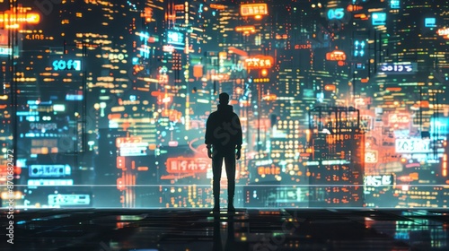 Fototapeta premium A digital businessman uses a computer to navigate the internet, showcasing modern technology and networking in a dynamic business environment.