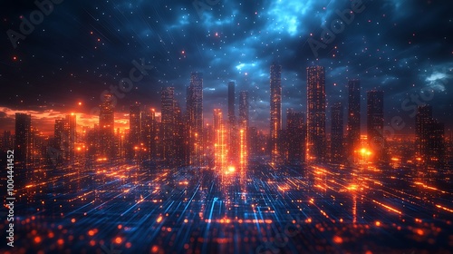 Obraz premium A digital city at night, glowing with advanced tech and lights.