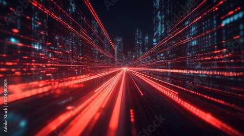 Obraz premium A digital city with a highway of red light streaks in the night.