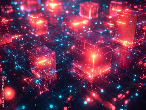 © Mira Studio, Obraz premium A digital cityscape with glowing interconnected cubes in a cyberpunk style, highlighted by cinematic lighting