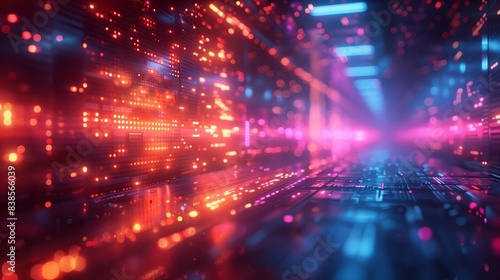 Naklejka premium A digital corridor with retro tech elements bathed in vibrant red and blue...