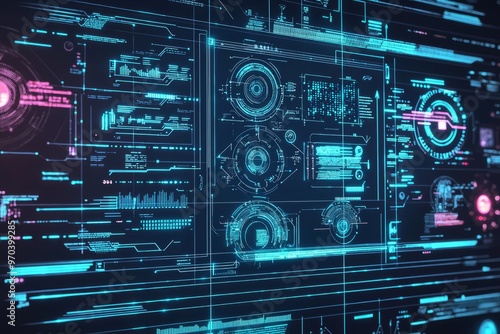 © Starlight, Obraz premium A digital display of a cybersecurity framework outlining different security layers and defensive measures. Visual elements include intrusion, Generative Ai