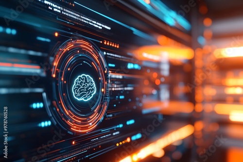 © Kultawatch, Obraz premium A digital display showing an AI chatbot interface with a holographic brain icon. Behind it, a futuristic server room with glowing data cables is featured.