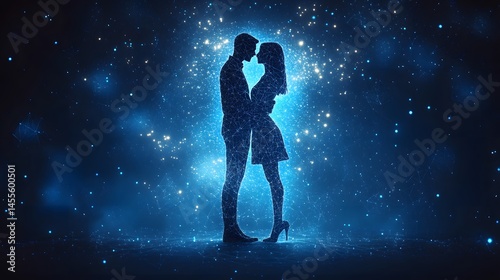 Fototapeta premium A digital embrace in the night sky. Interconnected figures suggest a romantic...