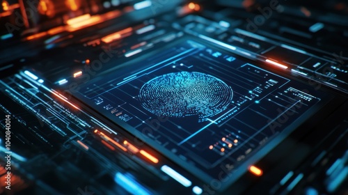 Fototapeta premium A digital fingerprint on a circuit board with glowing lines, representing...