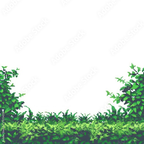 © Matthew, Fototapeta premium A digital forest landscape showcasing pixel art style with greenery and a blank sky, ideal for gaming or creative backgrounds