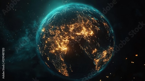 © savittree, Obraz premium A digital globe with illuminated pathways connecting major cities, representing real-time data flow and communication