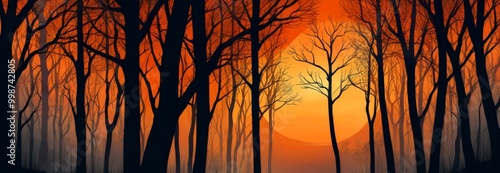 Fototapeta premium A digital illustration forest at sunset, featuring silhouetted trees against a warm orange and red sky