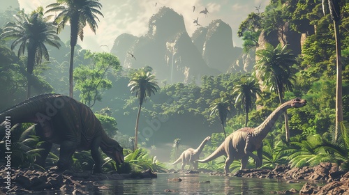 © Galib, Fototapeta premium A digital illustration of dinosaurs in a lush, tropical jungle.