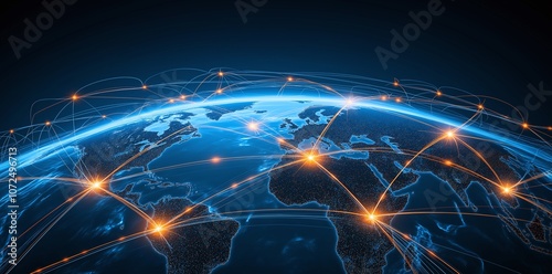 © Tondone, Obraz premium A digital illustration of global connectivity with glowing network lines on a 3D globe