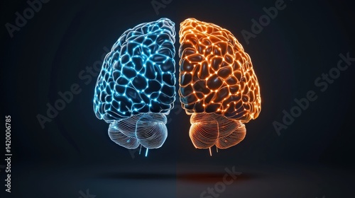© AGI Studio, Fototapeta premium A digital illustration of two brains, one blue and one orange, symbolizing creativity and logic, set against a dark background.