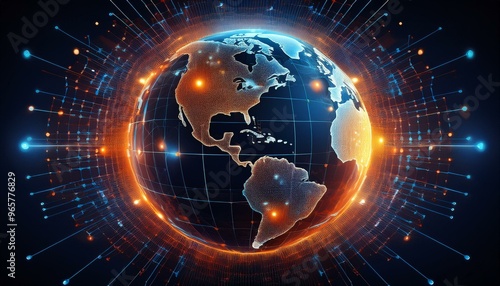 © Enrique, Obraz premium A digital image of the Earth with glowing orange and blue dots representing data and communication.