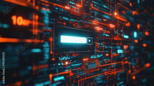 © BerkahStock, Obraz premium A digital interface with glowing lines and a search bar, representing technology and data.