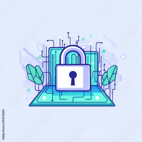 Fototapeta premium A digital padlock symbolizes cybersecurity on a tech-themed background with plants.