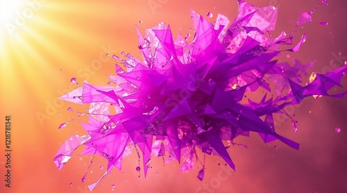 Naklejka premium A digital painting depicting ethereal fragmentation in warm golden hour light, infused with deep ultraviolet hues, vivid purples, high contrast, and soft light reminiscent of sunrise or sunset.