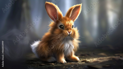 © Anna, Fototapeta premium A digital painting depicts a brown bunny rabbit amidst foliage and trees in a tranquil forest setting