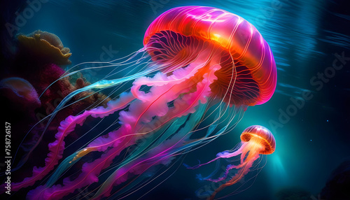 © Iqra, Fototapeta premium A digital painting of a bioluminescent creature in space, with vibrant colors and a dreamy atmosphere.