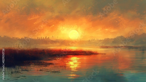 © Sang, Fototapeta premium A digital painting of a golden sunrise over a tranquil landscape.
