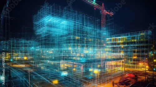 © ShinneProject, Fototapeta premium A digital rendering of a building under construction with a crane in the background. The building is illuminated with blue lights, and the crane is illuminated with red lights.
