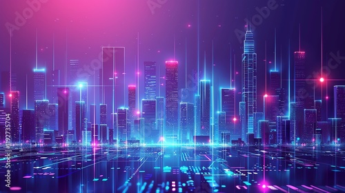 © Galib, Obraz premium A digital rendering of a futuristic cityscape lit up with neon lights and lines.