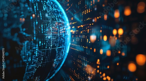 © Galib, Obraz premium A digital rendering of a globe made of data and code, with a background of glowing orange lights.