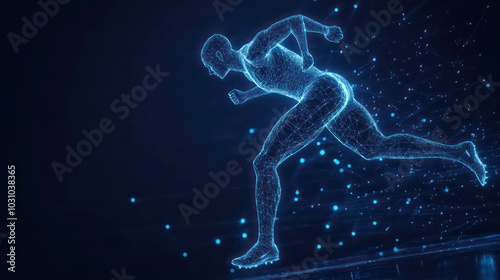 Fototapeta premium A digital rendering of a runner in motion, composed of glowing lines and particles, against a dark background.