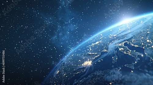 Obraz premium A digital representation of global connectivity featuring a network of data points and lines over a map of the Earth, all illuminated against a dark background