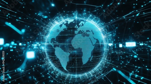 Obraz premium A digital representation of the Earth surrounded by glowing data lines,...