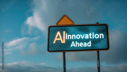 © TheWaterMeloonProjec, Obraz premium A digital road sign displaying the message "AI Innovation Ahead" is set against a backdrop of a clear blue sky, highlighting advancements in the realm of artificial intelligence.