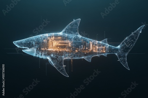 Obraz premium A digital shark illustration with illuminated circuitry and technical details...
