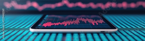 Fototapeta premium A digital tablet displays a vibrant, pink data graph on a teal background,...