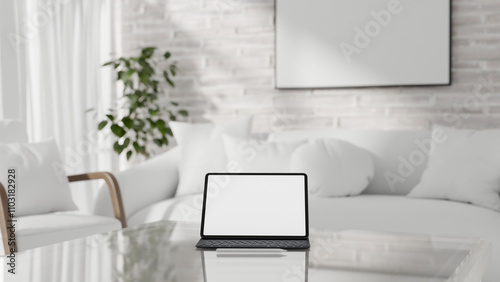 Obraz premium A digital tablet on a modern coffee table in a minimalist white living room.