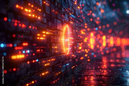 © Asif, Naklejka premium A digital wall with glowing red and blue lights.