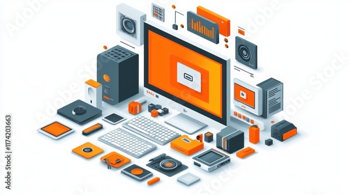 © AnggunArtworks, Obraz premium A digital workspace illustration featuring various tech components and devices.