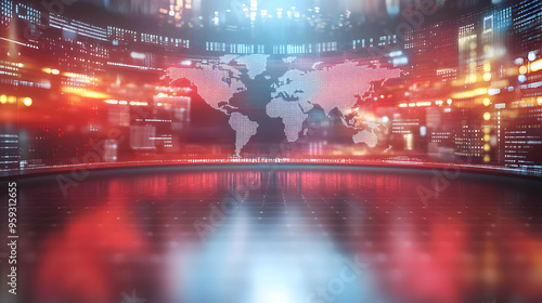 © Siasart Studio, Obraz premium A digital world map displayed on a futuristic screen with bright red and blue lights.