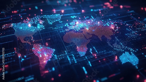 Obraz premium A digital world map illuminated with vibrant colors, showcasing data points...