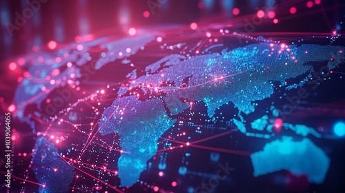 Obraz premium A Digital World Map with Red Lines and Blue Dots