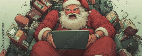 Naklejka premium A digitally illustrated Santa Claus furiously typing on a laptop, surrounded...
