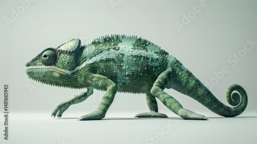 Fototapeta premium A digitally rendered chameleon, light teal green, walking profile. Detailed texture, spiky scales, and a curled tail. Against a plain, light gray backdrop