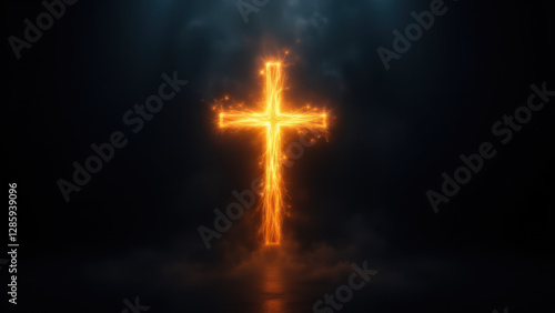 © Tameem, Fototapeta premium A digitally rendered cross glowing with a fiery design against a dark, smoky backdrop.