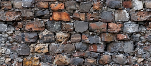 Obraz premium A dilapidated brick wall with deteriorating stones provides a weathered look in the close up copy space image