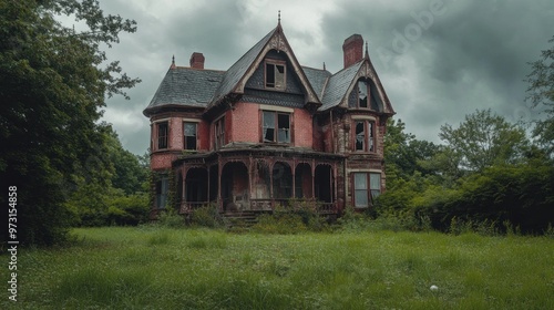 Obraz premium A dilapidated Victorian mansion surrounded by overgrown grass and trees under...