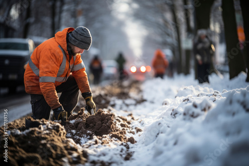 © Zireael, Fototapeta premium A diligent man braves the winter chill, tirelessly using his tools to clear the snow-covered streets, ensuring a smooth flow of traffic in the aftermath of a heavy snowfall.