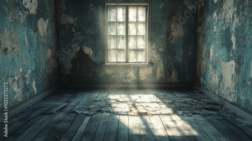 Fototapeta premium A dimly lit, abandoned room with cracked walls and broken floorboards, casting eerie shadows, and open copy space in the center for text or design elements