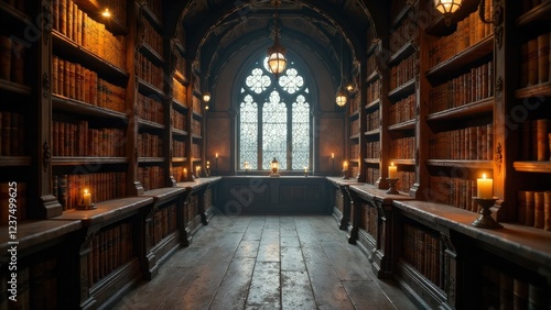 Fototapeta premium A dimly lit antique library with aged bookshelves, illuminated by candlelight, features a large gothic window