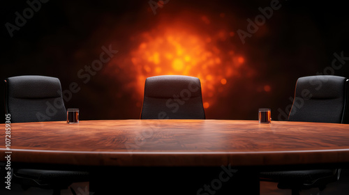 © Wonderful Studio, Fototapeta premium A dimly lit conference room features a large wooden table and several chairs, with a glowing fiery background creating a dramatic atmosphere.